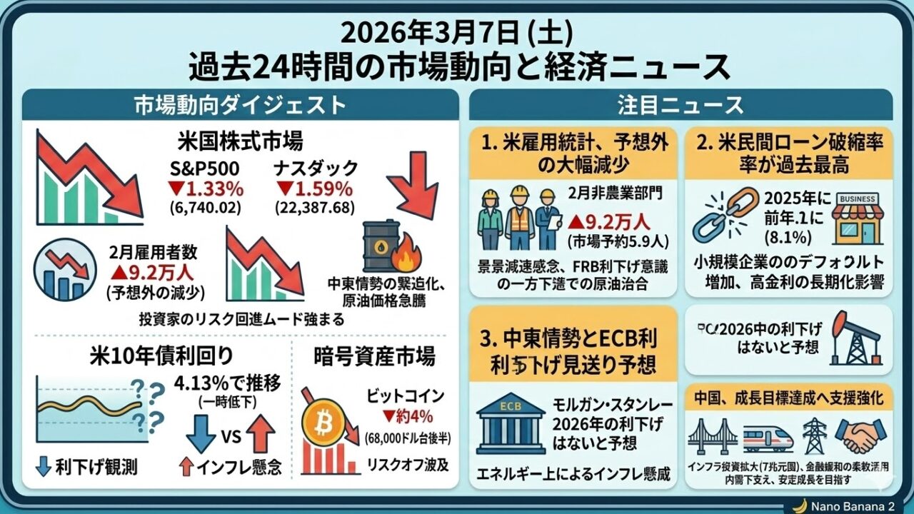米株式市場では、S&P500とナスダックがそれぞれ1.33%、1.59%下落し、前日比で6,740.02と22,387.68で取引を終えました。これは、2月の米国雇用統計で非農業部門の就業者数が予想外に▲9.2万人となったことや、中東情勢の緊迫化による原油価格急騰などを背景に、投資家のリスク回避ムードが強まった影響です。