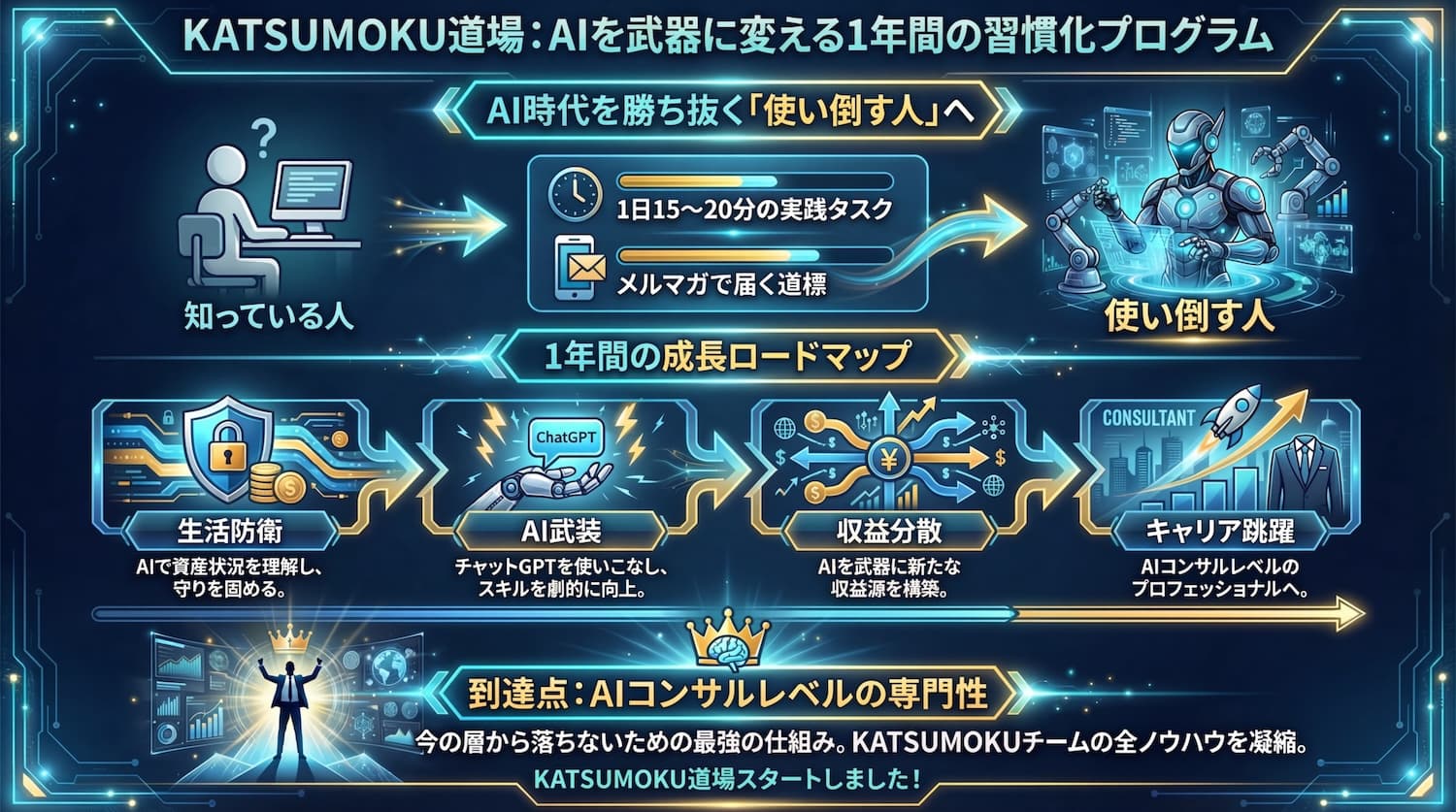 KATSUMOKU道場は、毎日15分~20分の実践で、AIを本当に使える武器へ変えていく1年間の習慣化プログラムです。